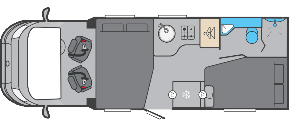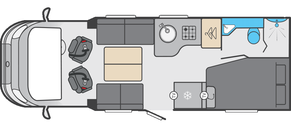 The 564 is perfect if you prefer a fixed rear bed for convenience and a more traditional layout. It’s the longest of the Voyager models and offers one of the best sleeping arrangements for couples who want quick bedtime setup without compromising lounge space.
