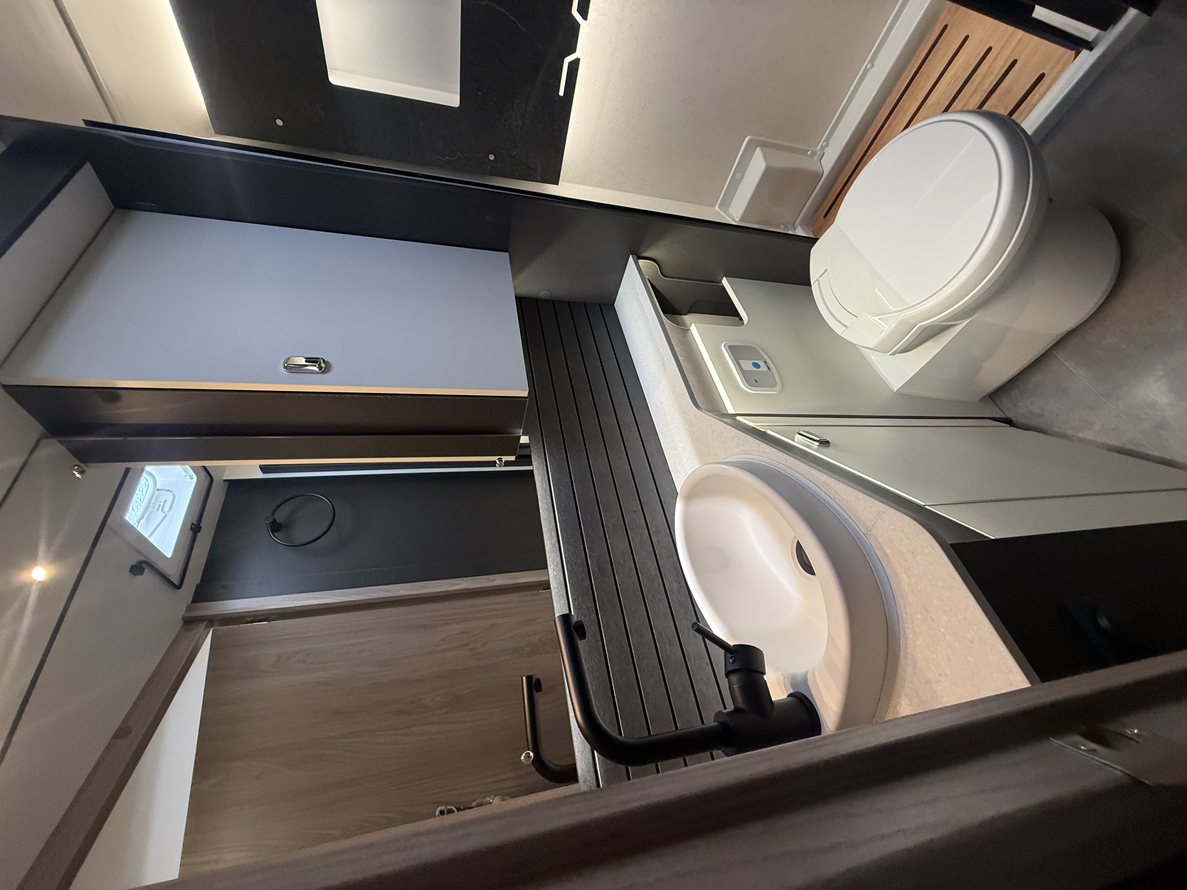 Rear-corner bathroom – conveniently located beside the bed