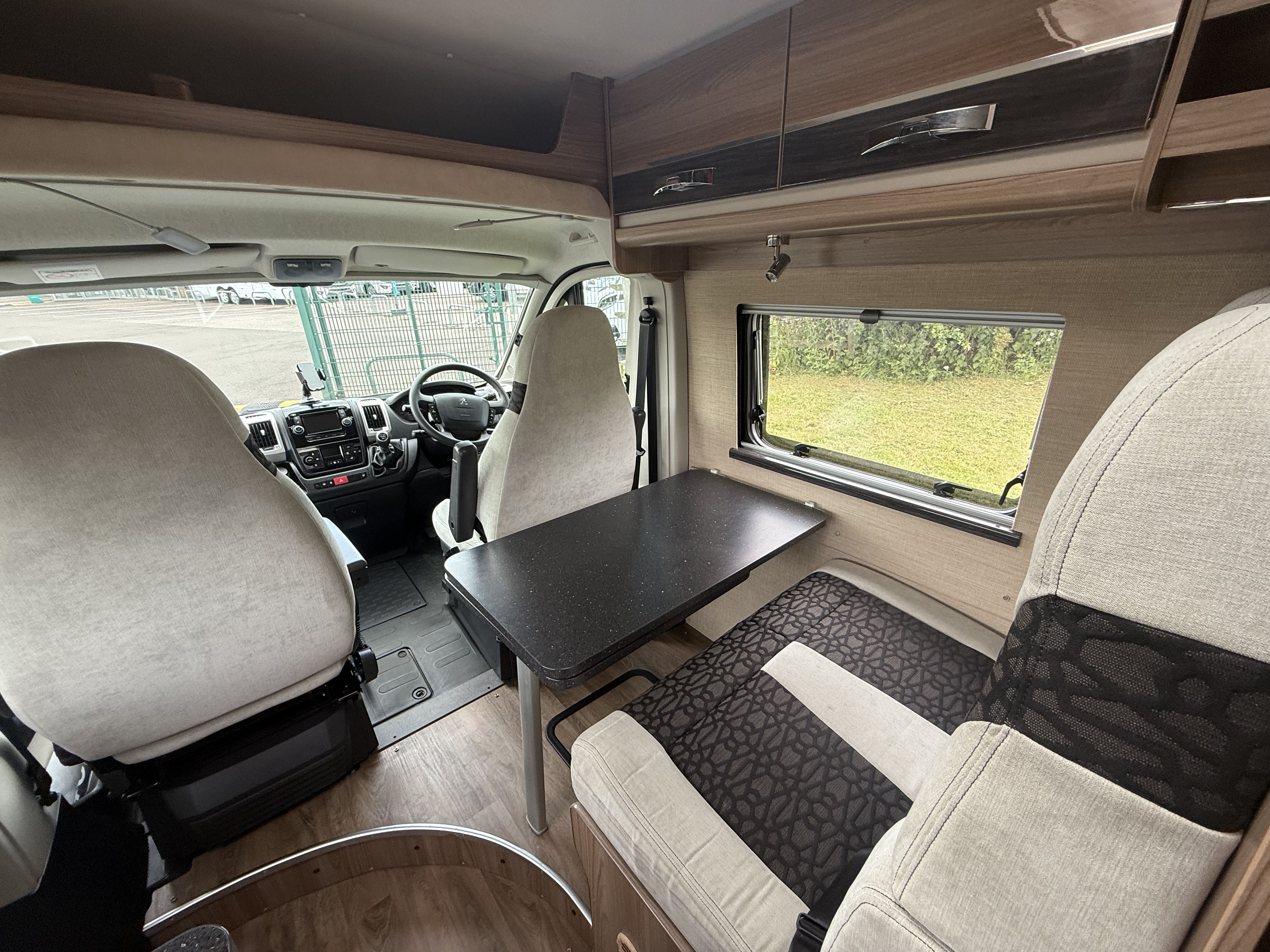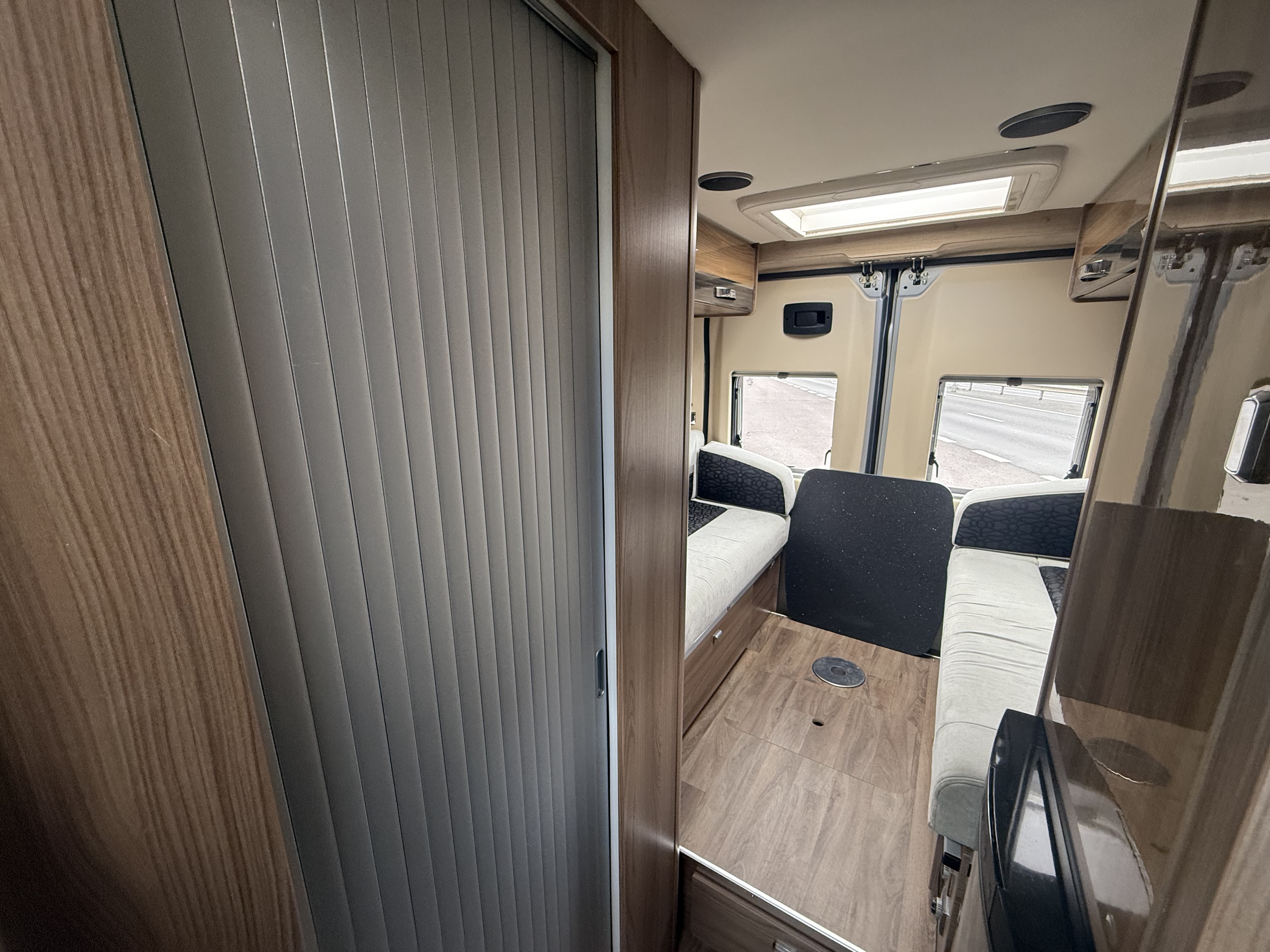Front dinette: Two travel seats swivel to dine and convert to an occasional single bed (~1.70 × 0.90 m / 5’7” × 2’11”)