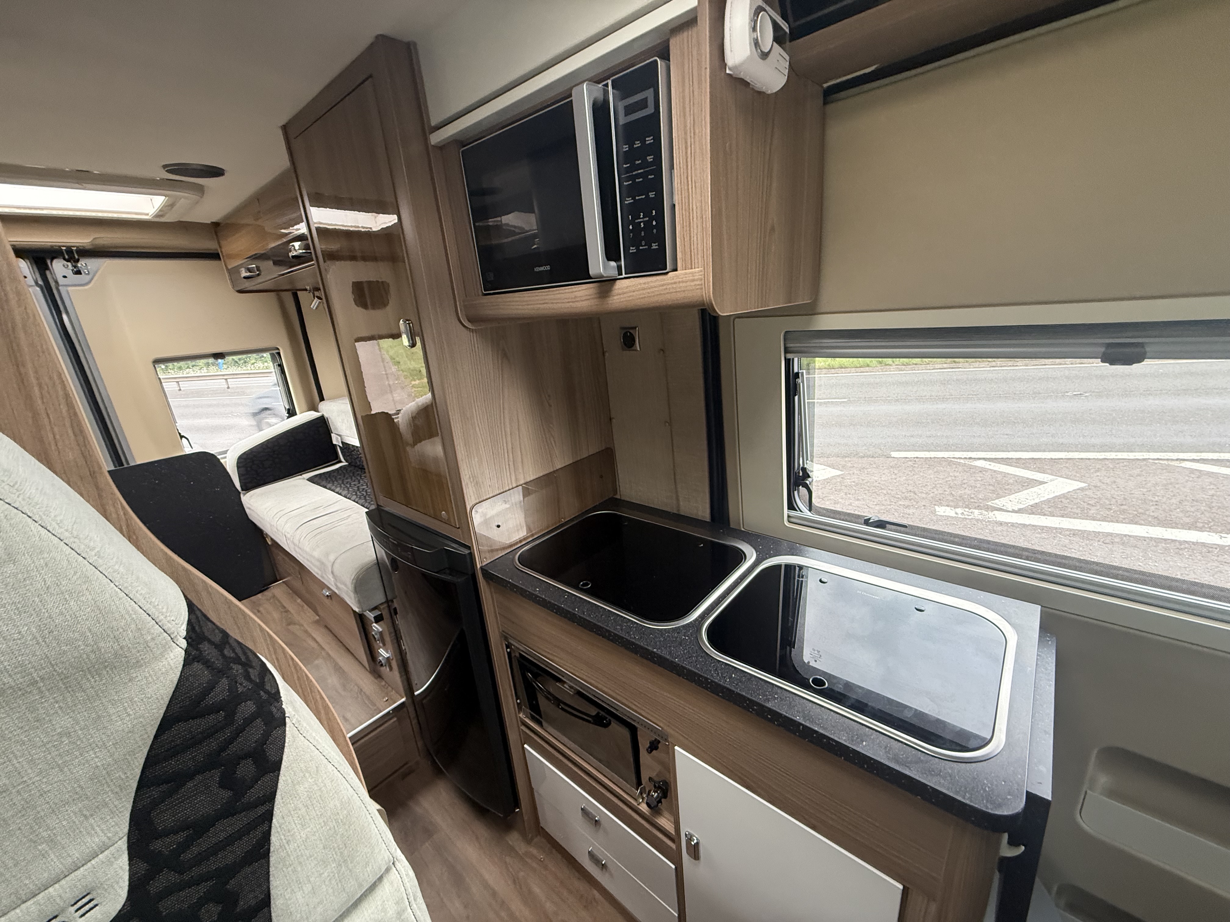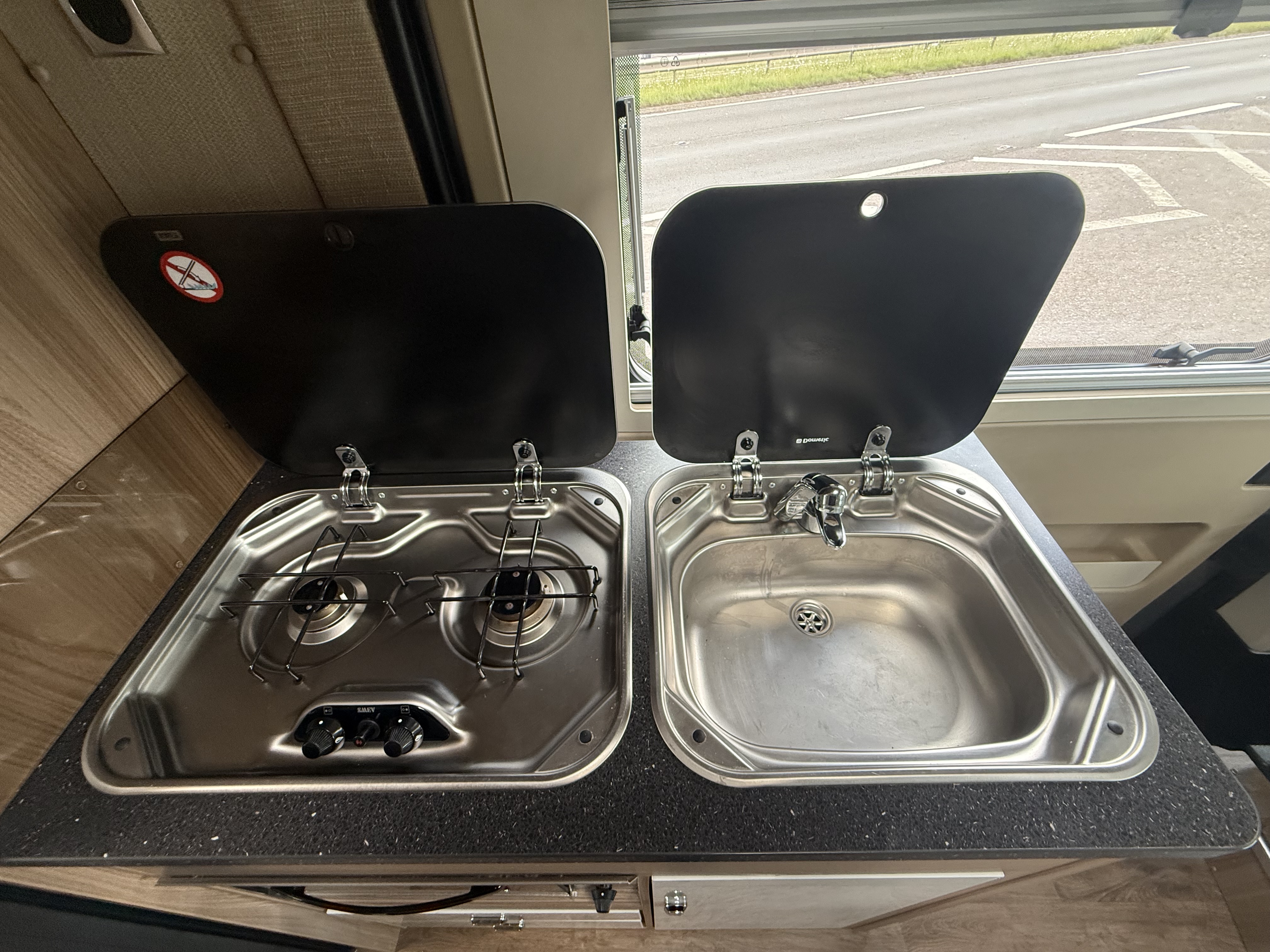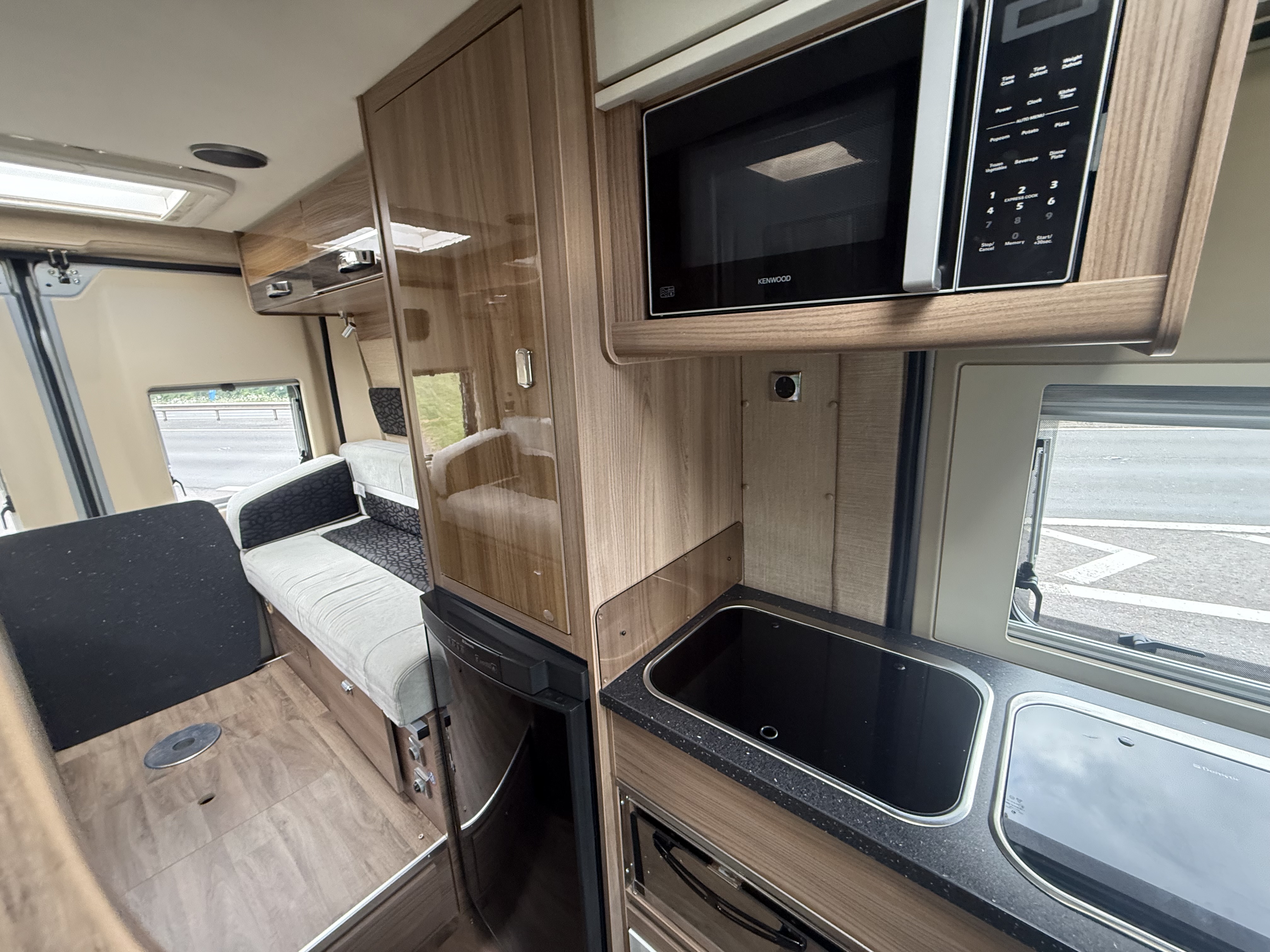 Galley: 2‑burner hob with grill, stainless steel sink with lid, microwave, Dometic 80 L 3‑way fridge/freezer