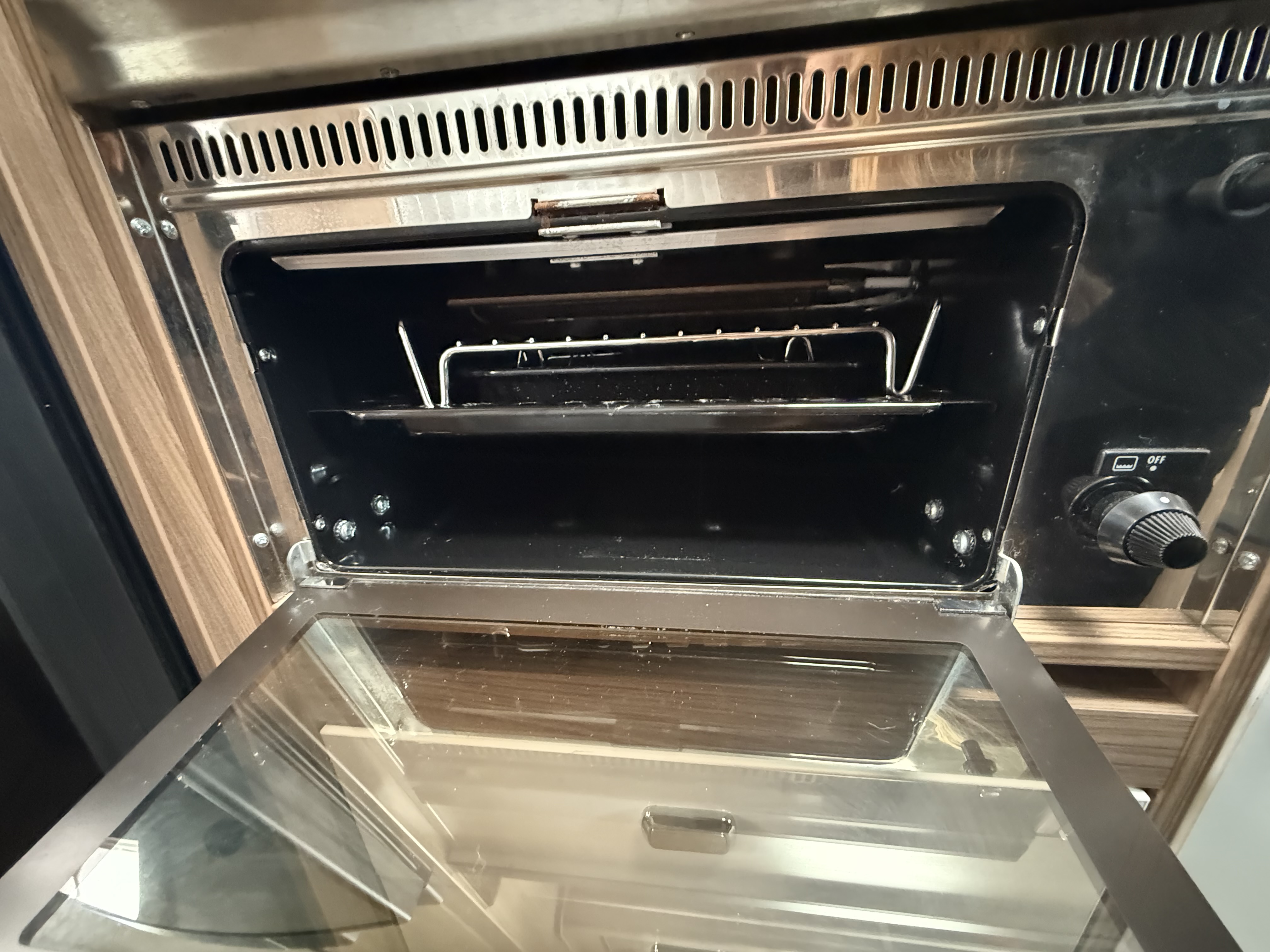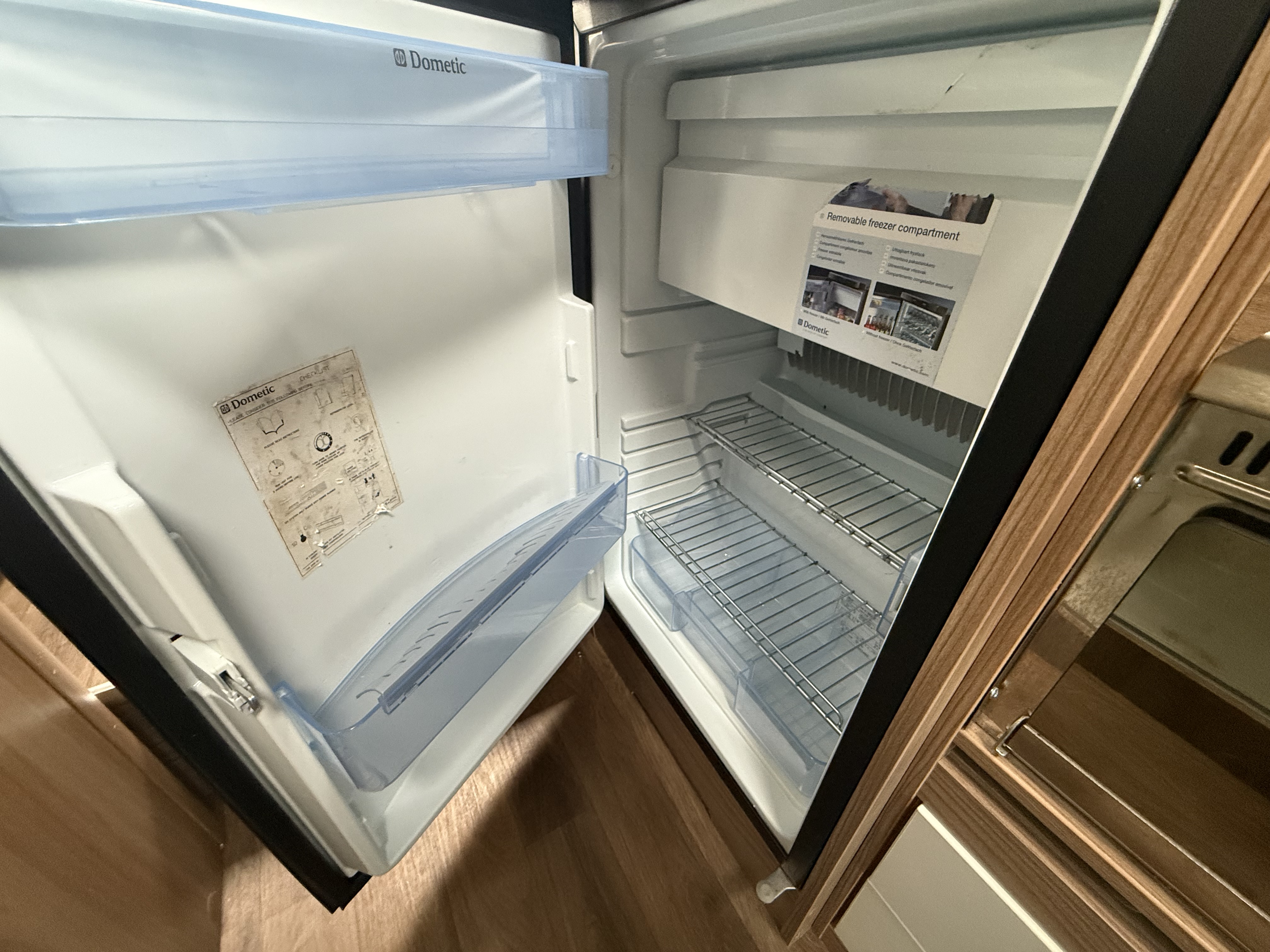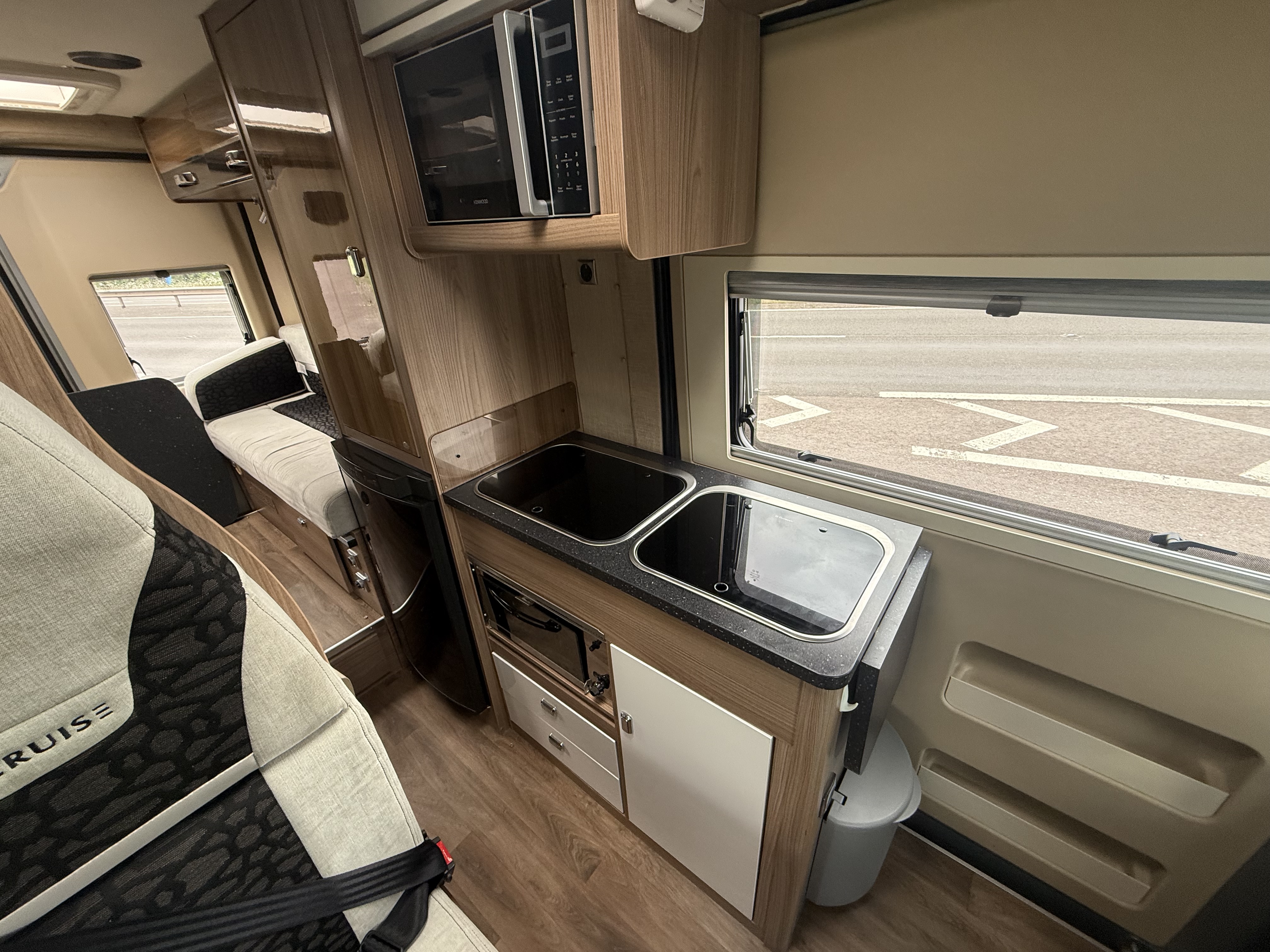 Galley: 2‑burner hob with grill, stainless steel sink with lid, microwave, Dometic 80 L 3‑way fridge/freezer