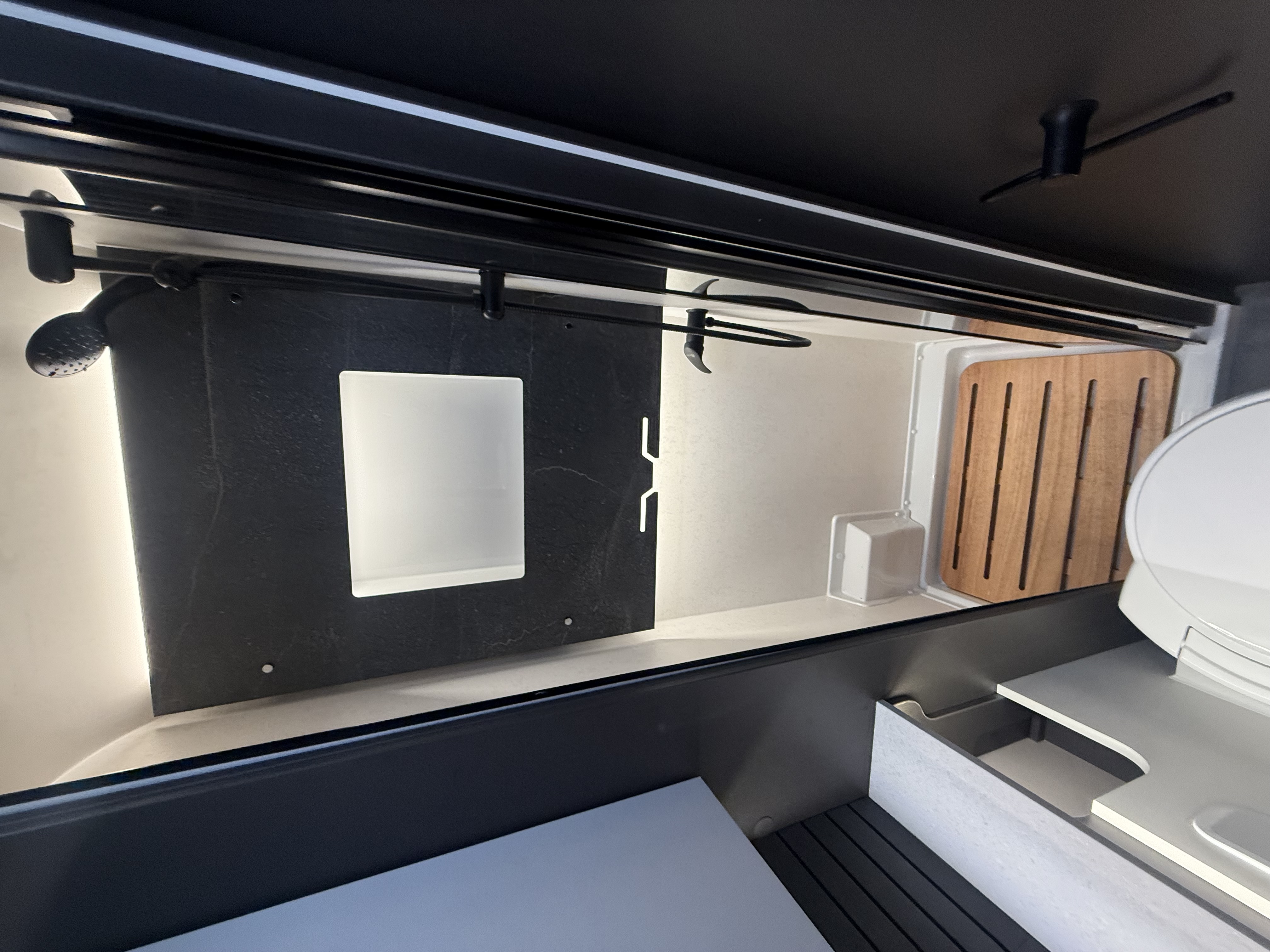 Rear-corner bathroom – conveniently located beside the bed