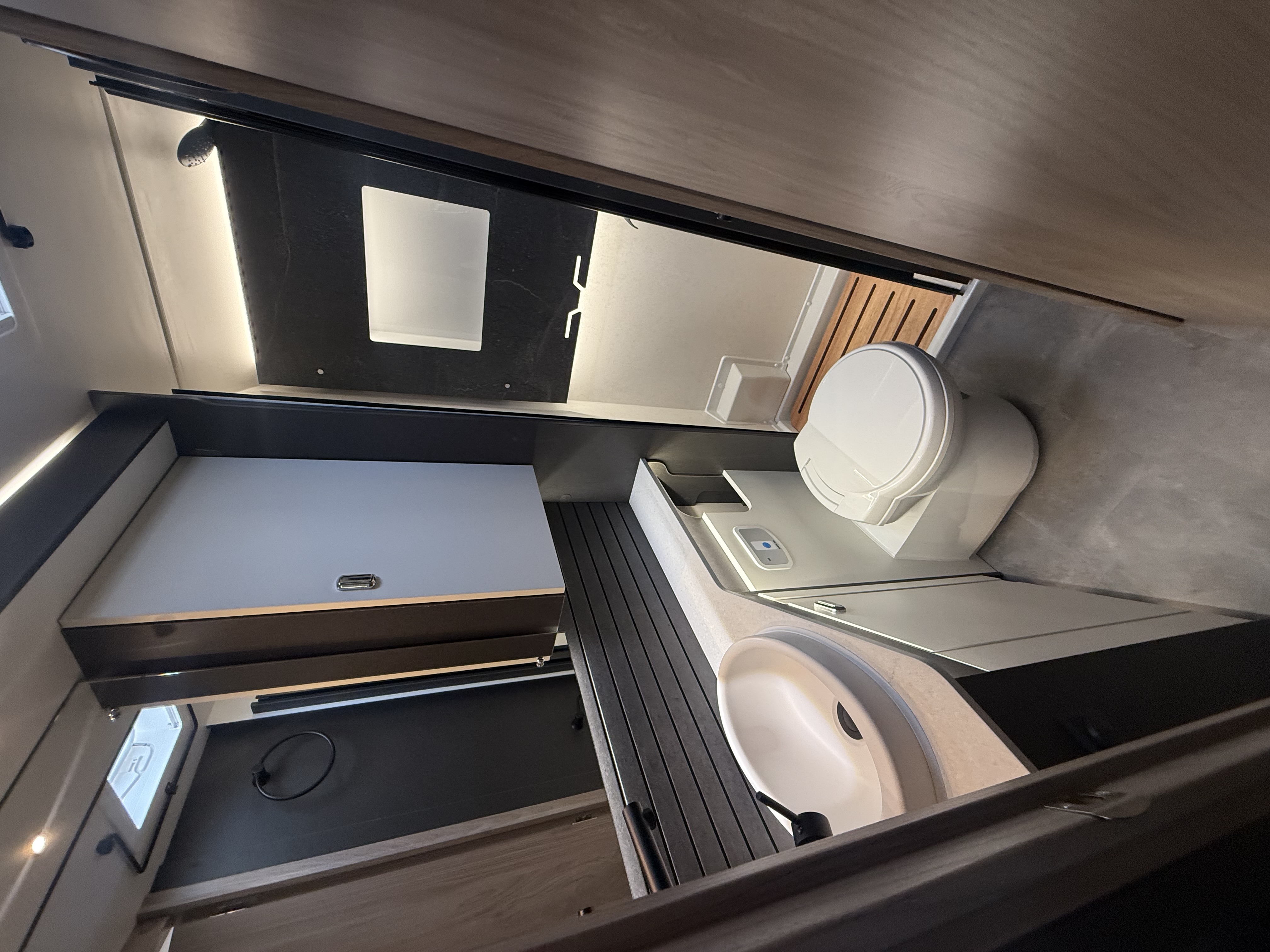 Rear-corner bathroom – conveniently located beside the bed